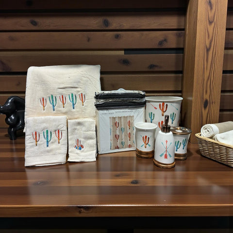 The Cactus 3 Piece Bath Accessory Set will add a fun southwestern feel to your bathroom. The pieces are adorned with turquoise and coral Saguaro cacti and arrows. Each piece features a unique image. Complete the look with our coral/turquoise cactus shower curtain and bath towel set, or get it all together in one cohesive bathroom set!