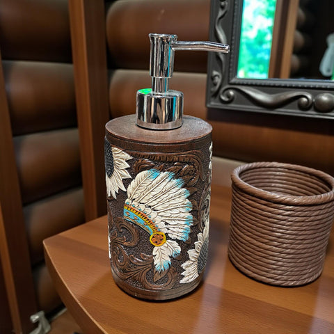 Add southwest style to your bathroom with this polyresin set featuring a tooled leather design with a headdress and sunflower accents.