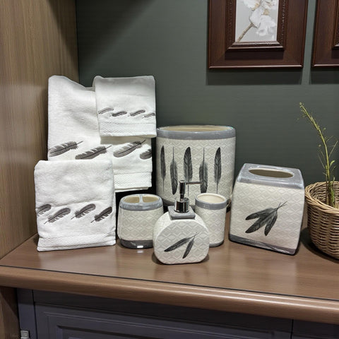 The Feather Design Countertop Bathroom Set captivates with serene shades of taupe and gray, intertwined with designs reminiscent of desert landscapes and scattered feather motifs. The set's gentle asymmetrical shapes, paired with brush-stroke gray borders, evoke an artisanal and handcrafted essence. Crafted from robust ceramic, a glaze overlay ensures a radiant shine. Accentuate a Southwestern or Western-inspired bathroom with additional accessories from our Feather Design Collection.