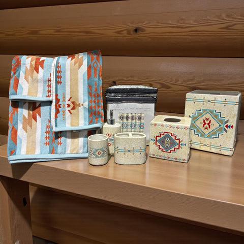 Inspire a vibrant Southwestern charm in your home with our Spirit Valley Ceramic Wastebasket, showcasing bold geometric patterns and striking colors of red, teal, taupe, and navy. Its taupe background is speckled with paint flecks for an artisan pottery feel. Complete a sophisticated Southwestern-style bathroom when you coordinate with other bathroom pieces in our Spirit Valley Collection.