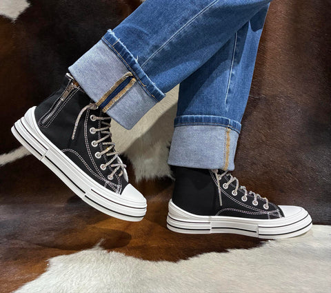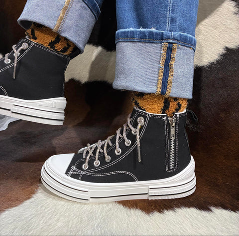 High top canvas sneaker with a wide toe box and SPARKLE laces! Side zipper to help get shoes on quicker. Laces are not stretchy, but there is slack to adjust to your foot width. Shoes run true to size.