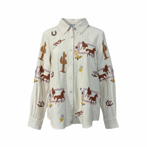 Fully western embroidered button up top. Wear it alone or use it for layering. This top is in a classic fit style.